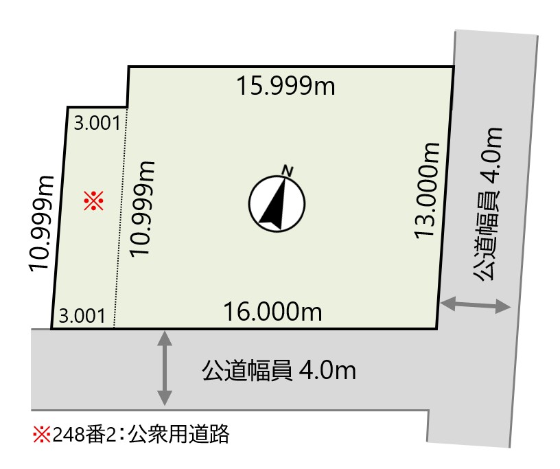 | 接道状況 | 北東側幅員4.0m公道に間口13.000m接道 南東側幅員4.0m公道に間口19.001m接道 | ||